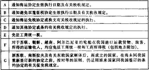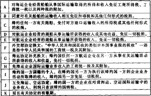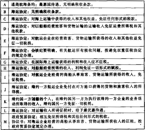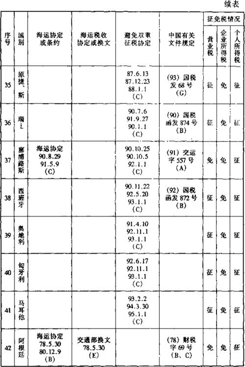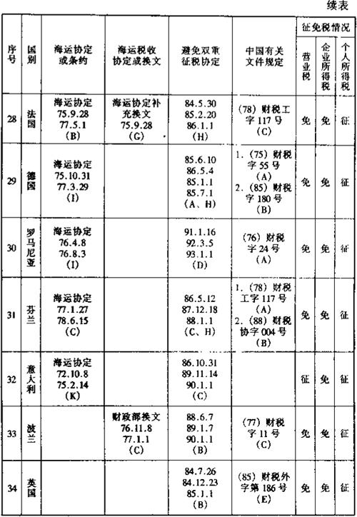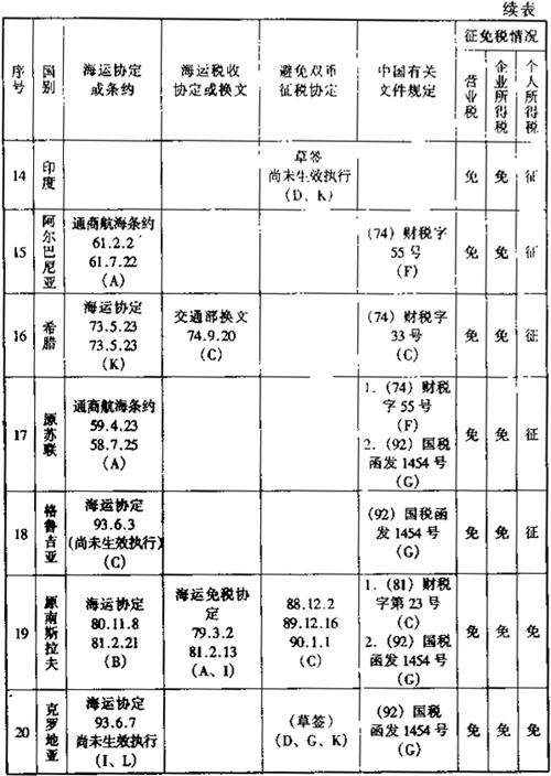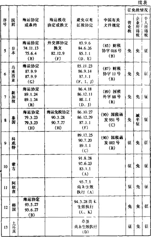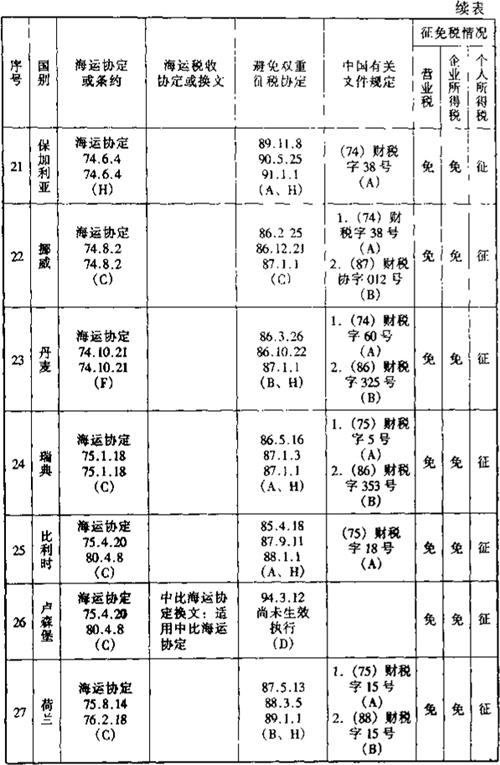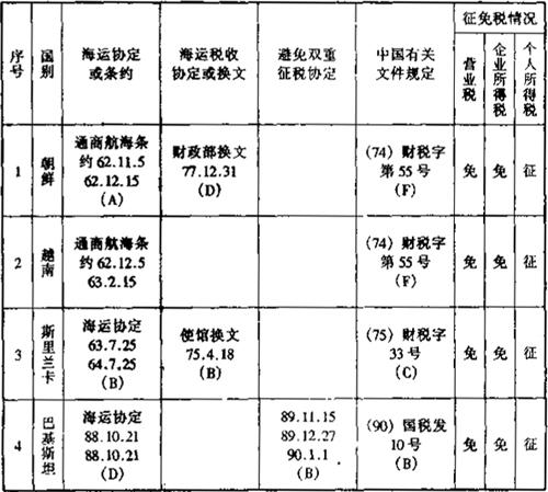 在上述的《通过协定、协议或换文解决国际海运税收问题览表》中,用阿拉伯数字表示的各种具体内容如下各附表: 表6-2 一览表附表1:有关海运协定或条约