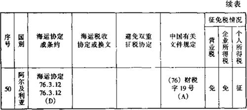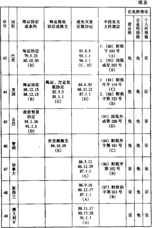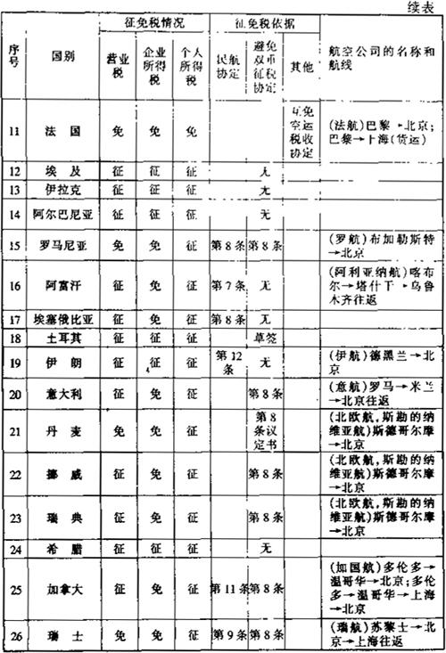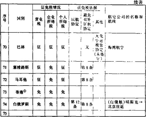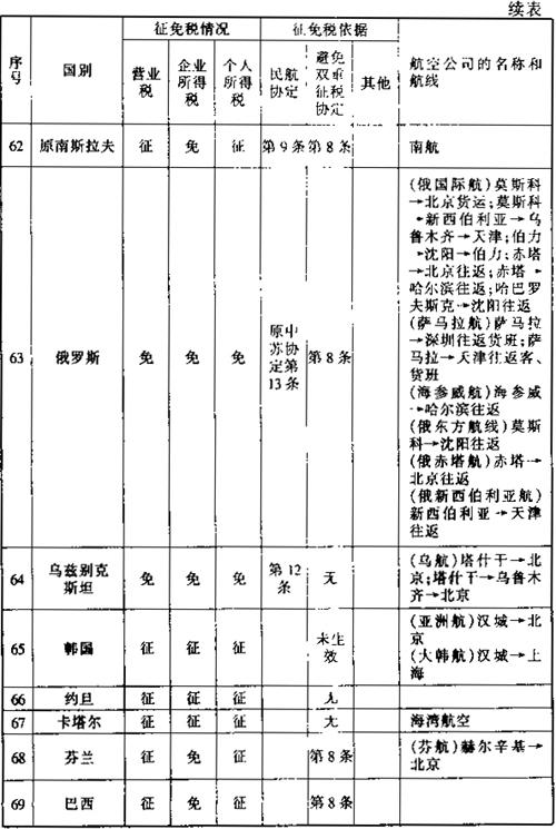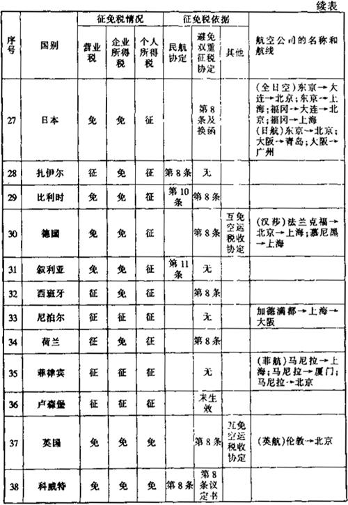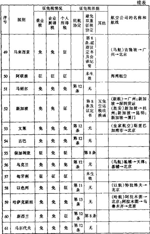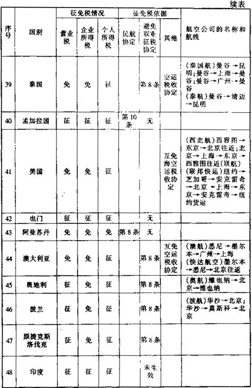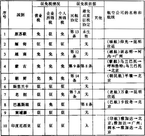 此外,还有一些其他的减税免税规定: 1.租用外国集装箱用于国际运输支付的租金暂免征收所得税。外国公司向我国境内企业出租集装箱取得的租金收入,应依据《外商投资企业和外国企业所得税法》的规定缴纳企业所得税。考虑到我国现有集装箱数量不能满足需要的实际情况,为有利于发展我国集装箱远洋运输业务,对外国公司、企业将集装箱租给我国公司、企业用于国际运输所取得的租金收入,暂免征收所得税。 2.租用外国船舶用于国际运输所支付的租金可暂免征收所得税。为了有利于我国发展远洋运输业务,对外国公司、企业将船舶租给我国公司、企业用于国际运输所收取的租金,同意暂免所得税。但对外国公司、企业将船舶租给我国公司、企业,用于我国沿海或内河运输所收取的租金仍应按《外国企业所得税法》第十一条的规定征收所得税。 3.租用外国集装箱用于国际运输所支付的租金暂免征收所得税。外国公司向我国境内企业出租集装箱取得的租金收入,应依据《外商投资企业和外国企业所得税法》的规定缴纳企业所得税。考虑到我国现有集装箱数量不能满足需要的实际情况,为有利于发展我国集装箱远洋运输业务,对外国公司、企业将集装箱租给我国公司、企业用于国际运输所取得的租金收入,暂免征收所得税。 (二)航空运输。凡我国对外签署的协议已明确减税、免税的,应按协议规定执行。本条所称协议,是指避免双重征税协定、互免航空运输业务收入税收协定和民用航空运输协定及其他有关的协定、换文等。 为便于执行空运税收政策,根据我国对外签订的避免双重征税协定、互免航空运输业务收入税收协定和民用航空运输协定及其他有关的协定、换文等,对空运税收征免税情况汇总整理如下表: 表6-6 外国航空公司征免税一览表 199 年 月