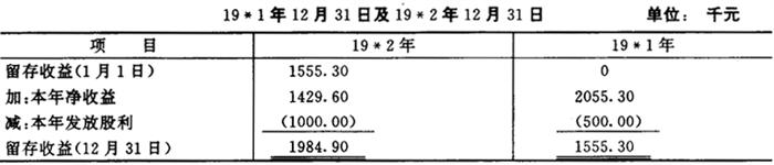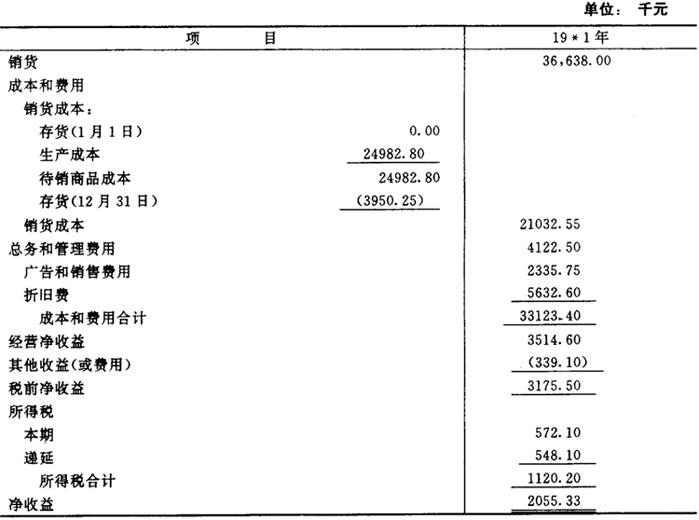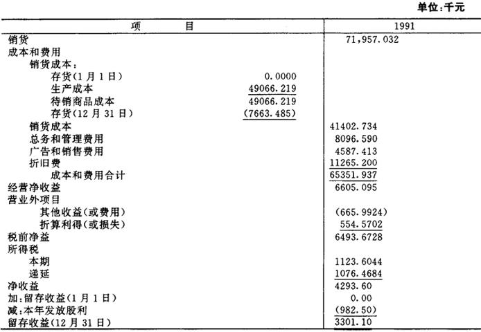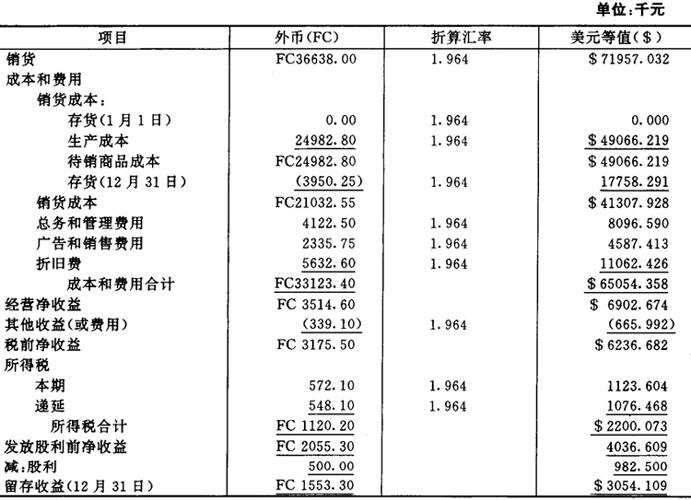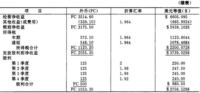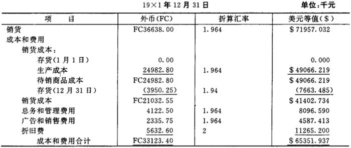 第二阶段,确定折算损益可通过倒轧得出,计算如下: 留存收益(19×1年1月1日) 0.0000 加:净收益 $2756.5298 减:留存收益(19×1年12月31日) 3301.1000 (参见图表3-10) 折得利得 $5445702 第三阶段,即把折算利得作为营业外项目列入收益表,列示如图表5-3-12。 图表5-3-12 WM公司收益表(以美元表示) 19×1年12月31日