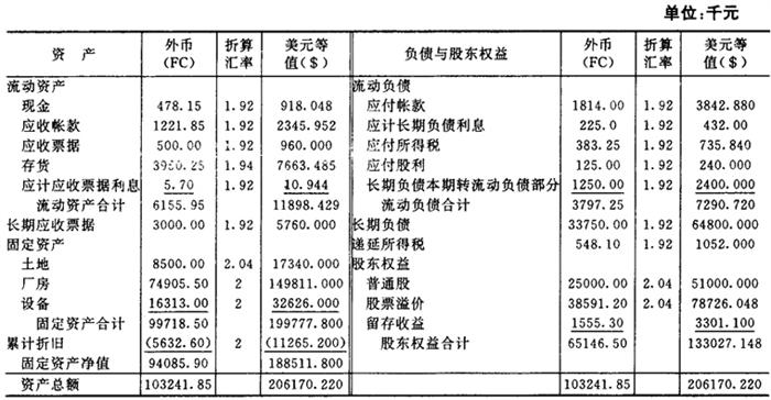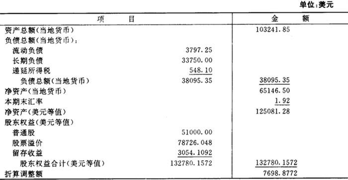(2)当地货币是功能货币时的折算程序。当WM公司的当地货币是其功能货币时,第52号财务会计准则公告要求以现行汇率法来折算其财务报表。一般地说,大多数资产负债表帐户用现行汇率折算;大多数收入和费用项目用当期平均汇率折算。因而,这一折算程序比较简单直接。不过,在采用现行汇率法时,可先对收益表进行折算。折算后以美元表示的WM公司收益表如图表5-3-13所示。要注意的是,此时折算损益不包括在收益表中,而将作为折算调整额列示在资产负债表的股东权益部分。折算后以美元表示的WM公司资产负债表如图表5-3-14所示。除普通股和股票溢价外,所有其他的资产负债表项目均以现行汇率1.92折算,而普通股和股票溢价则以其历史汇率2.04进行折算。折算调整额$(76988772)可通过倒轧得出。不过,为了验证计算的正确性,折算调整额的确定也可如图表5-3-15所示。 图表5-3-13 WM公司收益表(以美元表示) 19×1年12月31日