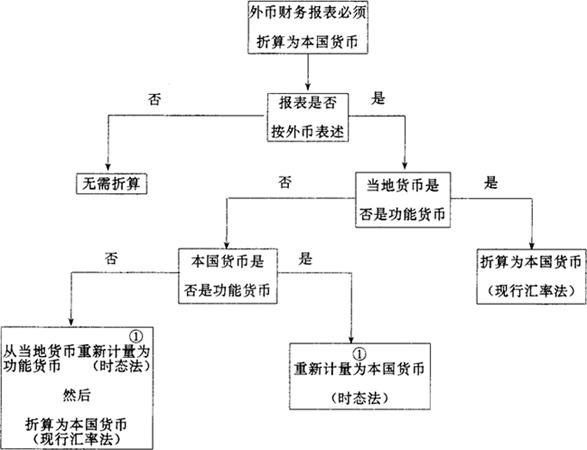 应当指出,在以上的论述和例题分析中,国外子公司的功能货币或为母公司的本国货币(美元),或为子公司所在国的当地货币。但有时子公司的功能货币可能既不是当地货币也不是母公司的本国货币,而是第三国的货币。例如美国的一家香港地区子公司的功能货币是英镑,但它按港元记帐。在这种情况下,它的当地货币(港元)报表就要首先用时态法重新计量(折算)为功能货币(英镑),然后,再用现行汇率法从功能货币折算为本国货币(美元)。 综上所述,按第52号财务准则公告要求,外币报表的折算程序可如图表5-3-16所示: 图表5-3-16 外币报表折算程序图