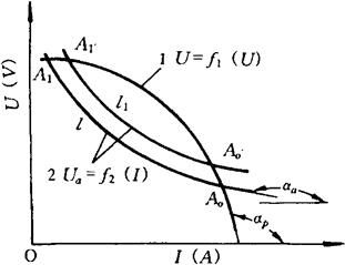 | 释义 | 对弧焊电源的基本要求 1.电源外特性 为使电源-电弧系统稳定工作,工作点必是电源外特性与电弧静特性的交点,如图11-6中的A0、A1点。若弧长因干扰由l增长到l1,则工作点由A0、A1移至A′0、A′1。干扰去掉之后,弧长恢复到原来长度l。原在A′0的电源电压高于电弧电压、焊接电流将增加,电源电压将下降,直至恢复到A0点为止,所以A0点是能够自动恢复的稳定工作点。A1′点的情况就不同了,当弧长恢复到l原弧长后,电源电压高于电弧电压,焊接电流增加,工作点不可能再回到A1点,而是逐渐移到A0点。所以A1点不是稳定工作点,只有A0点才是稳定工作点。作为系统稳定工作点A0应具备的条件是:在A0点电弧静特性曲线的斜率tgαa,与该点电源外特性曲线斜率tgαp之差大于零,即