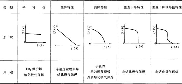 图11-6 电源-电弧系统稳定工作条件 此式即是电源-电弧系统的稳定工作条件。由于不同的焊接方法使用的电弧静特性区段不同。所以为满足系统稳定工作,不同焊接方法需要不同的电源外特性。常用电源外特性的形状和用途见表11-5。 表11-5 常用电源外特性形状及用途