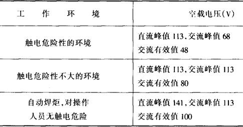 2.弧焊电源的空载电压 空载电压高容易引弧,电弧燃烧稳定。但过高则电源体积大,重量大,功率因数低,不经济,而且也不利于安全操作。所以在确保引弧容易、电弧稳定的条件下,应尽量降低空载电压。GB8118-87规定的空载电压的限制见表11-6。 表11-6 弧焊电源空载电压限值