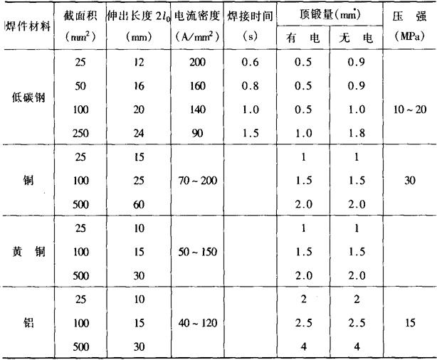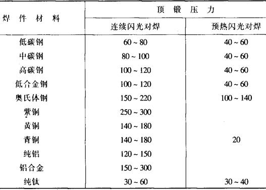 调伸长度(l):不应小于焊件直径的一半,即l=0.6~2d(d为焊件的直径)。 压力:由焊接压力(pw)和顶锻压力(pu)组成。 表7-41给出了几种电阻对焊的规范。 表7-41 电阻对焊规范