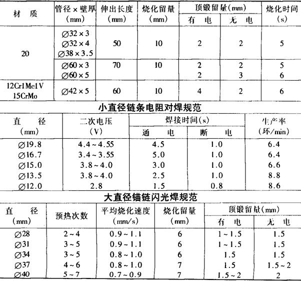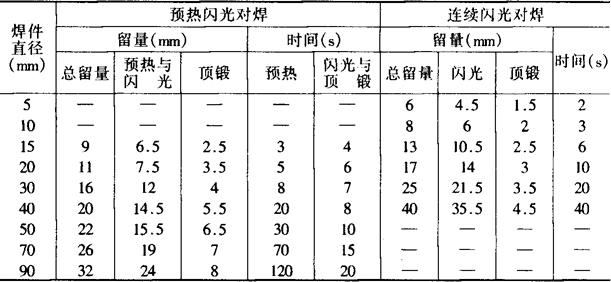 此外,还有空载电压、预热次数等。 闪光对焊是一种高效、高质量的焊接方法,适用于中、大截面工件的对接,最大截面积达100000mm2。可焊接碳钢、合金钢、铝、铜、镍、钛等金属,还可对接异种金属。几种材料的闪光对焊规范表7-37~表7-40。 表7-37 低碳钢棒材闪光对焊的时间和留量