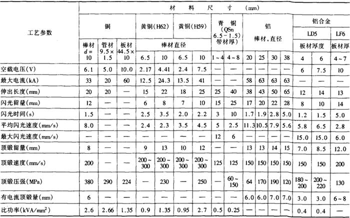 表7-39 有色金属及其合金闪光对焊的焊接条件