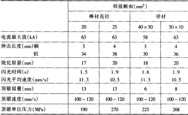 3.对焊设备 一般由机身、夹紧机构、进给机构、焊接电源、控制系统五个主要部分组成。通常分为电阻对焊机、连续闪光对焊机、预热闪光对焊机等。 表7-40 铜与铝闪光对焊的焊接条件