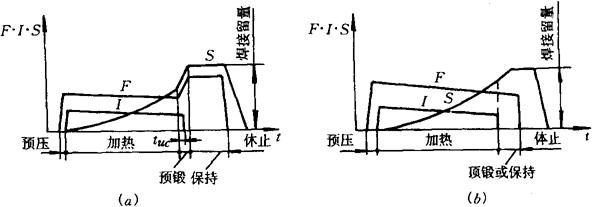 2.电阻对焊 (1)过程的特点:电阻对焊是由预压、加热、顶锻、保持、休止等几个阶段组成的,如图7-20所示。开始时,用较小的压力使焊件接触,接触电阻大。通电后,接触部分附近金属被快速加热,随着温度逐渐升高,到整个端面塑性区达到要求时,快速顶锻、形成焊接接头。