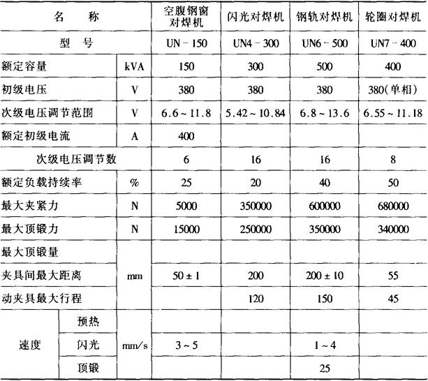图7-20 电阻对焊焊接循环图 (a)变压力式电阻对焊 (b)等压力式电阻对焊 F-压力 I-电流 5-位移 电阻对焊适用于塑性好,截面积小于300mm2的金属工件。工件被焊端面最好是形状简单的实心断面。一般用于丝材、棒材和板条的接长。 表7-42~表7-45给出了几类对焊机型号和技术参数。 表7-42 弹簧顶锻式对焊机技术数据