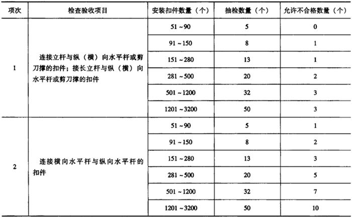 | 释义 | 对脚手架的质量检查 要确保脚手架的施工使用安全,首先要保证脚手架的质量,所以在脚手架使用之前,必须按照施工规范的有关规定,对脚手架的质量进行检查验收。 (一)脚手架构配件质量要求 1.新钢管必须有产品质量合格证,必须有质量检验报告;钢管的表面应光滑,不应有裂缝、结疤、分层、错位、毛刺、压痕和深痕划道;钢管的外径、壁厚、端面等的允许偏差,应分别符合规范规定,外形不得有硬弯,其表面应涂有一层防锈漆。 2.旧钢管表面的锈蚀度不得超过0.5mm。锈蚀情况应每年检查一次,在进行检查时,应在锈蚀严重的钢管中抽取3根,在每根锈蚀严重部位横向截断取样检查。钢管弯曲变形在端部长度1.5m以内不得超过5mm,立杆弯曲不得超过12mm。 3.新扣件应有产品质量合格证、生产许可证与专业检测单位的测试报告;旧扣件使用前必须进行质量检查,有裂缝、变形的严禁使用,脱扣的螺栓要进行更换;新、旧扣件均必须涂防锈漆。 4.钢脚手板尺寸允许偏差,表面挠曲不应超过12mm,表面扭曲(指任一角翘起)不应超过5mm,每块钢脚手板必须涂防锈漆。 木脚手板的宽度不宜小于200mm,厚度不宜小于50mm,其材质应符合规范规定,已腐朽的脚手板不能再用。 (二)脚手架的质量检查验收 1.脚手架的地基基础及初步检验 (1)脚手架的地基基础是否符合要求,关系到脚手架是否下沉和稳定。因此,基础完工后应对其进行认真检查,合格后才能进行脚手架的搭设。 (2)脚手架搭设完毕后,应进行下列检查,合格后方可申请验收: 1)脚手架的搭设位置、所用材料和构造是否符合技术要求,立杆的沉降与垂直偏差是否符合规定。 2)各种杆件的设置和连接,连墙件、剪刀撑、斜撑、水平加固杆、门洞桁架等的构造是否符合设计要求。 3)脚手架上的所有安全防护措施是否符合要求,如安全网、防护栏杆、交通通道、连墙件、脚手板等。 2.避雷及架空输电线路的安全距离 脚手架与架空输电线路的安全距离、工地临时用电线路的架设及脚手架接地避雷措施等方面,是否按《施工现场临时用电安全技术规范》(JGJ 46—2005)中的有关规定执行。 (1)施工现场临时用电工程所使用的电气设备、装置、元器件和电线、电缆等电气产品必须按照国家和省有关规定经国家“3C”认证和省建设工业产品登记备案。使用单位相关人员应当对购买的电气设备、装置、元器件和电线、电缆质量进行核查,不合格产品不得用于临时用电工程。 (2)当施工电梯、物料提升机以及高架脚手架等金属设施处于相邻建筑物、构筑物等设施防雷装置接闪器保护范围以外时,应按“滚球法”和规范规定确定和设置防雷装置,防雷装置的接闪器(避雷针)应设置于其最顶端,宜采用圆钢或焊接钢管制成,圆钢直径不应小于16mm,钢管直径不应小于25mm,长度应为1~2m,其防雷引下线可利用该设备的金属结构体,但应保证电气连接。 3.脚手架验收时应具备的基本文件 在进行脚手架验收时,应具备以下基本文件:脚手架的施工设计文件及组装图;脚手架部件的出厂合格证、试验报告和质量合格标志;脚手架工程的施工记录、班组自检记录和工程项目部的检查记录;对升降式脚手架应有提升设备、绳具的出厂合格证和承力桁架、导向承重柱、横向承力刚架式托架、防坠装置等的试验记录证明;脚手架工程的施工验收报告。 4.验收的组织和重点验收的项目 (1)验收的组织分工 高度在25m及25m以下的脚手架,由项目工程负责人组织技术和安全检查人员进行验收;高度大于25m的脚手架,由上一级技术负责人随着工程进度分阶段组织工程项目负责人、技术和安全检查人员进行验收。 (2)重点验收项目 对于脚手架的重点验收项目,主要包括以下6个方面,并要作好验收记录,详细地记在验收报告中。 1)安装后的扣件,其拧紧螺栓的扭力矩应用力矩扳手抽查,抽样方法应按随机均布原则进行;抽样数目与质量判定标准,应按表4-7的规定确定,不合格时必须整体重新拧紧,并经复验合格方可验收。 表4-7 扣件拧紧质量、抽样数目及判定标准