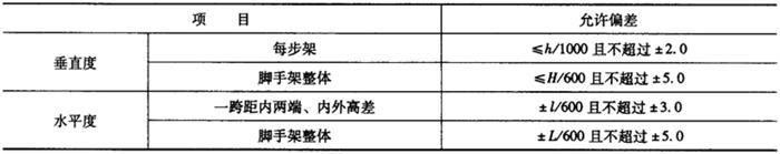 2)杆件是否齐全,连接件、挂扣件、承力件与建筑物的固定件是否牢固可靠。 3)脚手架上的安全设施(安全网、护栏、挡脚板等)、脚手板、导向和防坠装置是否齐全和安全可靠。 4)脚手架下的基础是否平整坚实,支垫是否符合要求。 5)连墙件的规格、数量、位置和竖向水平间距是否符合要求。 6)脚手架的垂直度及水平度是否合格,其偏差应符合表4-8中的要求。 表4-8 脚手架搭设垂直度及水平度偏差