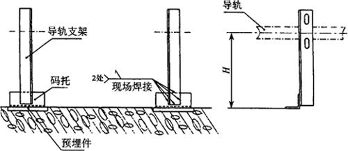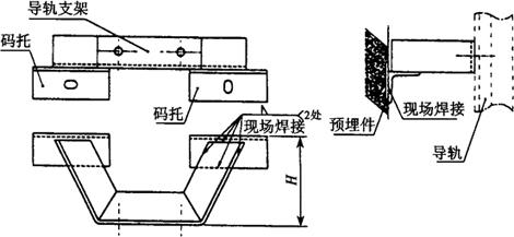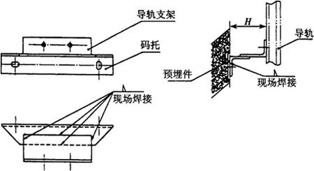 | 释义 | 导轨支架 导轨支架也称导轨托架,是把导轨固定在电梯井道内的支承件,设在井道壁、钢筋和中间支承梁上,导轨经由导轨压板安装其上。按适用对象分,有轿厢导轨支架、对重导轨支架和轿厢对重共用支架;按组成结构分,有整体式和组合式。整体式由型钢弯曲焊接而成,制造容易,强度高;组合式安装方便,高度尺寸可调节。 导轨支架要求每根导轨至少应有两档以上的导轨支架,但对于最上段导轨,如果导轨长度小于800mm,则只需要用一档导轨支架进行固定。导轨支架间距应不大于2500mm。 典型的轿厢导轨支架如图4.1-1所示,典型的对重导轨支架如图4.1-2所示。