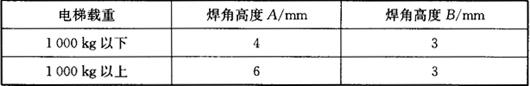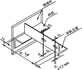 图4.1-16 导轨支架垂直误差 (3)导轨支架焊接要求:支架搭入码托的深度应大于等于码托的2/3,如图4.1-17所示D的尺寸。支架和码托搭接处焊接的焊角高度见表4.1-3,焊缝必须是连续的,并应全焊。 表4.1-3 焊角高度要求