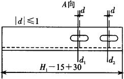 图4.1-13 轨厢导轨支架长度 (二)导轨支架的定位 (1)导轨支架与导轨底的接触面应平行于其对应的样线(d1、d2)所确定的平面,其平行误差应在0.5mm之内。在图4.1-12中,a1、a2、a3、a4的数值相差在0.5mm以内。 (2)导轨支架与导轨底的接触面与对应样线(d1、d2)的距离应为1~3mm(以便校轨时插入垫片),如图4.1-12所示。 (3)导轨支架上用来固定导轨的长圆孔(对重支架)或圆孔(轿厢支架)的中心线应与对应的样线(d1、d2)重合,其偏差在1mm以内,如图4.1-14所示。