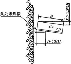 图4.1-17 支架搭入托码的深度 (四)注意事项 (1)焊缝必须连续,焊角高度必须小于表4.1-3所规定的要求。 (2)导轨支架靠近井道壁侧不需要焊接。 (3)导轨支架水平度误差X>1.5%H。 (4)导轨支架和码托的搭接长度D<2/3L。 |