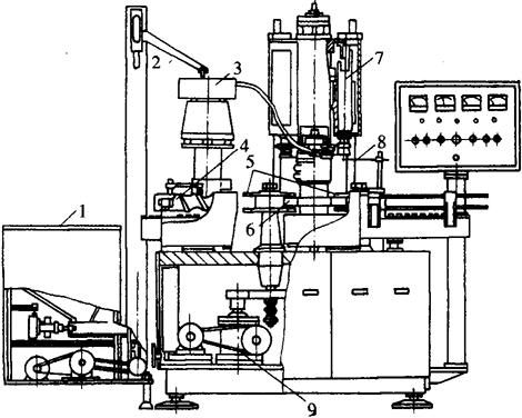 图2-3-14 皇冠盖压力封瓶机 1-贮盖箱 2-磁性带 3-电磁振动给料器 4-供瓶装置 5-进出瓶拨轮 6-压盖转盘 7-压盖机头 8-吊瓶安全装置 9-宽皮带无级变速器 图2-3-15所示为压盖机头压力封口的主要执行机构。其工作过程如下:瓶盖由供盖装置送到压盖机头的导槽定位,当瓶子输送到托瓶转盘上的封口工位时,随着压盖机头的下降,瓶子进入导向环10内,使瓶子与机头的中心对中,这时瓶子被套上一个盖子,随后压杆7在小弹簧3的作用下将盖子压向瓶口;由于压盖机头继续下降,紧压在瓶口上的瓶盖逐渐进入压盖模9的圆锥形空腔内,此时大弹簧2通过压盖模向瓶盖的四周施加压力,迫使皇冠盖的周边产生变形,并逐渐向瓶口收缩,最后扣在瓶口下部的凸缘处,使瓶盖和瓶口牢固地连接在一起而形成密封性封口;随后压盖头上升,在小弹簧3的作用下压杆7将压盖后的瓶子从压模中推出,从而完成压盖封瓶工作。