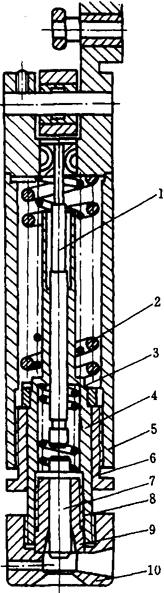 图2-3-15 压盖头 1-调节杆 2-大弹簧 3-小弹簧 4-导套 5-导筒 6-外螺套 7-压杆 8-内螺套 9-压盖模 10-导向环 2.2 扭断盖滚压封瓶机(图2-3-16)