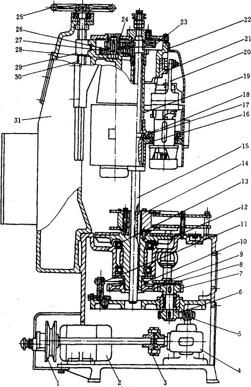 图2-3-16 扭断盖滚压封瓶机结构图 1-皮带无级变速器 2-电动机 3-联轴器 4-蜗轮减速器 5、6、7、8-齿轮 9、10-链轮 11-张紧链轮 12-托瓶转盘 13-机座 14-中心拨轮 15-主轴 16-滚压机头座 17、18-齿轮 19-空心轴 20-滚压机头 21-圆柱凸轮 22-机身 23、24、26、 27、28-齿轮 25-手轮 29-螺母 30-螺杆 31-立柱 滚压螺纹封瓶形成的过程大致如下:当铝盖套在瓶口上时,首先通过压盖给铝盖施加一定的压力,使瓶盖和瓶子在滚压过程中不发生相对运动。接着旋转着的螺纹成形滚轮同时向铝盖移进,进行滚压。其中螺纹成形滚轮在铝盖的外圆柱面上滚压出与瓶口螺纹形状相同的螺纹,使铝盖产生永久变形,与瓶口的螺纹完全吻合;旋转着的封边成形滚轮则滚压铝盖的裙部,使其周边向内收缩,并扣在瓶口螺纹下沿的端面上,然后螺纹成形滚轮和封边成形滚轮离开铝盖,压盖头上升,从而完成一次工作循环。 2.3 塑料盖旋合封瓶机 在自动灌装线中,它用以对已灌装好的酒类(如白酒、果酒)、饮料的玻璃瓶容器,用塑料盖旋合封口。 本机旋盖工作所需的螺旋运动,通过灌装瓶固定不动,瓶盖既转动又作轴向直线运动的方法来实现。旋盖的工艺过程如图2-3-17所示。主要过程如下。
