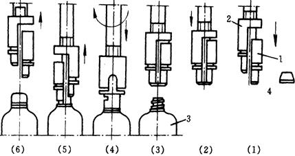 图2-3-17 旋盖工艺过程图 1-右半爪夹头 2-左半爪夹头 3-瓶体 4-瓶盖 2.3.1取盖〔图2-3-17(1)〕 此时要求旋盖爪夹头不转动,右半爪夹头1下降至供盖位置取盖。 2.3.2 捉盖〔图2-3-17(2)〕 旋盖爪夹头不转动,左半爪夹头2快速下降至供盖位置,与右半爪夹头一起将盖4捉紧。 2.3.3 对中〔图2-3-17(3)〕 旋盖爪夹头不转动,两半爪夹头将盖4转至旋盖工位,并置于瓶口3上方,要使瓶体与机头中心相互对中。 2.3.4 旋盖〔图2-3-17(4)〕 两半爪夹头开始旋转,并同时下降,将瓶盖4旋紧在瓶口上。 2.3.5 脱瓶〔图2-3-17(5)〕 两半爪夹头停止旋转,并先后上升与瓶盖4脱离。 2.3.6 复位〔图2-3-17(6)〕 旋盖机头恢复到起始位置,即右半爪夹头1又下降至取盖位置〔图2-3-17(6)〕。 2.4 电磁感应式铝箔封瓶机(图2-3-18)
