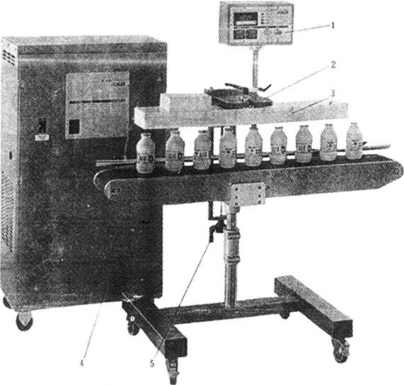 图2-3-18 电磁感应式铝箔封瓶机 1-操作箱 2-线圈支架 3-电磁热传道线圈 4-主控制箱 5-线圈高低调整器 该机主要是靠电磁感应的原理将瓶口上的铝箔片瞬间产生高热,然后熔合在瓶口上,以达到封瓶的目的。该机适用多种材质瓶子,如塑料瓶和玻璃瓶(金属材质除外)。 |