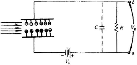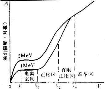 图10.2-4 气体探测器电流回路示意路 图10.2-5示出了某入射粒子能量为2MeV和1MeV时变化情况。图中A表示ab两点的输出电压(用对数坐标),V是附加工作电压。在O和V1之间,A随V增加,在此区间内能量高的粒子产生的电压也较高。在V1-V2区间内A不随V变化,但是2MeV的入射粒子引起的输出电压几乎是1MeV的入射粒子的两倍,这一区间就是电离室工作的区间,称为电离室区。工作电压继续上升超过V2时,输出电压也增加,直至V3的这段区间内,输出电压与入射粒子的能量成正比,所以称这个区间为正比区。若工作电压继续上升直至V4,输出电压仍随互作电压增加,并仍可以区分不同能量的入射粒子,但不再与入射粒子的能量成正比,这个区间称为有限正比区。在工作电压超过V4的情况下,输出电压已与入射粒子的能量无关,即无论入射粒子的能量多少,只要它与计数管气体起作用,它的输出电压是相同的,这个区域称为盖革(Geiger)区。