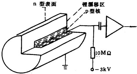 图10.2-8 在p-n结上加反向偏置后,各区的电位分布 C=KA/(4πW) 式中 A为p-n结的面积;W是耗尽区的宽度;K是半导体材料的介电常数。对于同样的辐射,电容愈小,输出的信号愈大,信噪比也愈高。 目前使用最为广泛的半导体探测器是锂漂移锗(Ge(Li))探测器,它是把锂单晶扩散到锗单晶上制成,现在已能做到灵敏体积在250cm以上。它要在液氮温度下使用保存。由于半导体材料工业的发展,现在已能制出杂质浓度低于10-13的超高纯锗(HPGe)本征锗探测器,其性能可和Ge(Li)相比,并可在室温下保存。Ge(Li)和HPGe探测器结构类型如图10.2-7所示。图10.2-9则示出了一个单开端的Ge(Li)探测器结构。