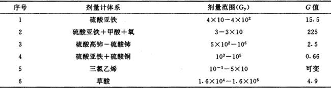 5.化学剂量计 化学剂量计是用来测量吸收剂量的一个重要手段。在这种方法中,吸收剂量是由测量介质中所产生的化学变化(包括化合键的变化,以及自由基的变化)来确定的。辐射化学产额是用来表征化学变化量与化学体系吸收辐射能量之间关系的物理量,定义为n(X)除以E的商,其中,n(X)是化学体系从辐射得到平均能量E后,产生、破坏或变化的某一指定成分X的平均物质量。即 G(X)=n(X)/E 辐射化学产额的单位是mol·J-1,通常G的数值是以每l00eV能量产生的某一指定离子的平均数目表示。如硫酸亚铁剂量计在60Coγ射线照射下的G(Fe)值为15.5。不同的化学体系有不同的辐射化学产额。表10.2-2是几种化学体系在60Co辐照下的G值。 表10.2-2几种化学剂量计在60C0辐照下的G值