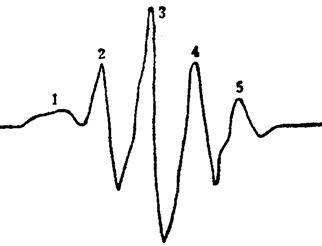 在射线辐照下,丙氨酸分子的C-H键断裂,失去氨基,形成CH3-CH-COOH一个未偶电子,称为自由基。自由基的数目和所吸收的剂量成比例,可借助ERS谱仪测出自由基数目,从而得到吸收剂量,所以丙氨酸/ERS剂量计的实质是自由基型剂量计。 在外磁场作用下,顺磁物质中未偶电子的自旋磁矩有两种不同的取向,形成两个能级E1和E2,其能量差ΔE与Lande因子g、Bohr磁子β和磁场强度H的关系是 ΔE=E2-E1=gβH (10.2-23) 对给定物质,β和g都是常数,因此ΔE就正比于磁场的强度,如果在垂直于外磁场的方向加上一个频率为v的高频电场,并使它满足以下条件: hv=gβH 则处于E1能级上的部分未偶电子吸收能量hv后,可跃迁到E2能级上,这一过程称“共振吸收”,它是顺磁物质中未偶电子在磁场中吸收一定波长的电磁能而产生共振跃迁的物理现象。 ERS波谱仪由微波发生器产生的高频微波hv经波导系统偶合到放置样品的共振腔。共振腔位于电磁铁两级之间的间隙中。腔内样品对磁场作线性扫描。当改变磁场强度H满足式(10.2-23)的共振条件时,出现自旋共振,样品吸收微波功率hv后,使通过共振腔的微波功率发生变化。用微波检测器检测这一变化,并用放大器将其放大,最后用示波器显示或用记录仪记录,得到ERS信号(如图10.2-10)。图中显示了5个高度不等的峰。中间主峰的幅度最大,它的幅度正比于吸收剂量。