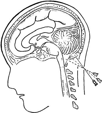 图125 小脑延髓池穿刺 (二)体位: 1.卧位:取侧卧位,头下垫一枕头,使头颈和躯干保持水平状,头稍前倾,使下颌接近于胸骨上部。 2.坐位:患者身略前倾,头向前曲,前额及手臂应有扶靠,勿使活动。 (三)间接穿刺法:右手持针,左手拇指摸清病人第二颈椎棘突,由该处上凹刺入,以眉间为方向,当针尖触及枕骨大孔后缘时,应向下方缓慢移动,此时每次进行不得超过1~2毫米,继续深入约0.5厘米,即可进入小脑延髓池,当穿过硬脑膜时,可感到阻力突然消失,此时,取出针芯即有脑脊液溢出。如不见脑脊液流出时,可用空针轻微抽吸,或将穿刺针稍向后退出,若仍不见脑脊液流出,则应重新穿刺。 (四)直接穿刺法:于枕骨大孔后沿与第一颈椎之间直接穿刺,当感觉阻力消失,示已进入池内,此时应停止向前穿刺,取出针芯,可见脑脊液流出。 四、注意事项 (一)穿刺深度,应据病人胖瘦而定,成人一般约为4~6厘米。穿刺进针4厘米后,多采用每进针0.5厘米,取出针芯,观察有无脑脊液流出。小儿更应频频观察。 (二)小脑延髓池本身深约1厘米,针已过硬膜,切勿继续进针。 (三)穿刺过程中,要始终保持穿刺针的正中方向,切勿向两侧偏斜,以免误伤小脑延髓池两侧血管。 |