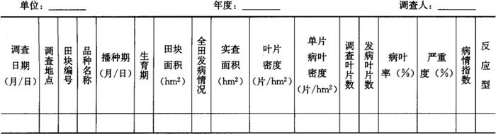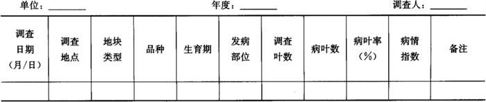 2.2 大田普查 2.2.1 调查时间 分别在小麦秋苗期、拔节期和乳熟期进行3次普查;小麦叶锈病菌冬季繁殖区在秋苗发病盛期调查。同一地区各年调查时间应大致相同。 2.2.2 调查田块 依据小麦栽培区划和常年秋苗发病情况选定若干代表性区域,在各代表性区域内选感病品种的早播和适期播种麦田调查。调查田块数量根据秋苗发病程度确定,一般不少于10块地。 2.2.3 调查方法 若叶锈病处于点片发生期,随机5点取样,每点检查67m2,记录单片病叶数。另外,每块田还需选取1m行长(条播田)或0.5m2(撒播田)代表性样点,计数叶片数目用以估算叶片密度(片/hm2)。 若全田普遍发病,随机5点取样,每点2m行长或1m2,随机检查100个叶片的发病情况(乳熟期调查旗叶或旗下一叶)。记录调查结果并汇入表4-105。 表4-105 小麦叶锈病病情普查表