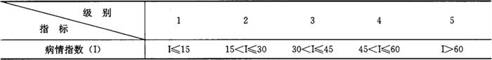 式中: D——病叶平均严重度(%); di——各严重度级值; li——各级病叶数; L——调查总病叶数。 4.1.2 病情指数 用以表示病害发生的平均水平。用下列公式进行计算: I=F×D×100 式中: I——病情指数; F——病叶率; D——病叶平均严重度。 4.2 测报资料收集、汇报和汇总 收集小麦播种期和各期播种的小麦面积、灌溉麦田面积及其他必要的栽培管理资料;主要品种栽培面积、生育期、苗情和抗锈性以及当地气象台(站)主要气象要素的预测值和实测值。 全国区域性测报站每年定时填写小麦叶锈病模式报表报上级测报部门。 对小麦叶锈病发生期和发生量进行统计汇总,记载小麦种植和叶锈病发生、防治情况,总结发生特点,进行原因分析。 4.3 发生程度分级标准 小麦叶锈病的发生程度以当地发病盛期平均病情指数确定,划分为5级,各级指标见表4-106。 表4-106 小麦叶锈病发生程度分级指标