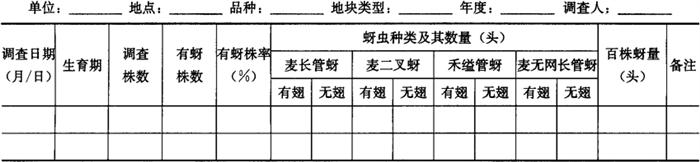 注:地块类型是指早、中、晚播田或高肥水田等。 2.2 大田普查 2.2.1 普查时间 在小麦秋苗期、拔节期、孕穗期、抽穗扬花期、灌浆期进行5次普查。同一地区每年调查时间应大致相同。 2.2.2 普查田块 根据当地栽培情况,选择有代表性的麦田10块以上。 2.2.3 普查方法 每块田单对角线5点取样,秋苗期和拔节期每点调查50株,孕穗期、抽穗扬花期和灌浆期每点调查20株,调查有蚜株数和有翅、无翅蚜量,记录结果并汇入小麦蚜虫大田普查表4-131。 表4-131 小麦蚜虫大田普查表