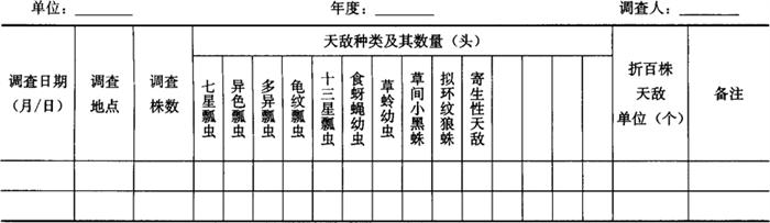 2.3 天敌调查 2.3.1 调查时间 在每次系统调查小麦蚜虫的同时,进行其天敌种类和数量调查。 2.3.2 调查方法 寄生性天敌以僵蚜表示。僵蚜取样点和取样方法与蚜虫相同,每次查完后抹掉;瓢虫类、食蚜蝇幼虫和蜘蛛类随机取5点,每点查0.5m2,用目测、拍打方法调查。将调查天敌的数量分别折算成百株天敌单位,记录结果并汇入小麦蚜虫天敌调查表4-132。 表4-132 小麦蚜虫天敌调查表