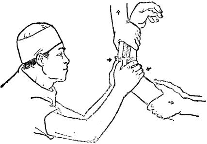 图10~54 尺、桡骨干双骨折分型 一、横形或多段骨折:多因直接打击、机器挤压伤所致,骨折为横形,两骨的骨折线常在同一平面上。偶有一骨或两骨多段骨折。常伴有严重的软组织损伤。 二、桡骨横形尺骨斜形骨折,多因跌仆时手掌撑地所产生的间接暴力,使桡骨中部或上部发生横断骨折。残余暴力使尺骨下段发生斜形骨折。 三、螺旋形骨折:在遭受间接暴力的同时,前臂又受到一种扭转伤力,造成两骨的螺旋形骨折。两骨折线方向一致,但平面不同,尺骨骨折在上,桡骨骨折在下。 【症状和诊断】 前臂肿胀、疼痛、畸形,旋转功能障碍,局部有异常活动及骨擦音,X线摄片检查,可明确骨折类型及移位程度。但摄片时最好应包括肘、腕关节的前臂正侧位X线片,注意有无合并上、下桡尺关节脱位。 【整复方法】 一、拔伸牵引:伤员仰卧肩外展70~90度,屈肘90度,中及下1/3骨折前臂置中立位,上1/3骨折前臂稍旋后位,一助手握肘部,另一助手握手部大、小鱼际,沿前臂纵轴逐渐牵引,一般3~5分钟后,重迭移位和成角畸形即可得到矫正。 二、挤捏分骨:术者用两手的拇指和食、中、环三指,由骨折部的掌、背侧紧贴皮肤对向挤捏骨间隙,随着牵引逐渐加大分骨力,使骨间膜重新悬张,骨嵴对应,旋转移位即可矫正。 三、成角折顶:横形骨折重迭移位严重,单靠牵引难以矫正者,可用折顶手法。在维持牵引情况下,术者两手拇指由背侧推按突出的骨折断端,其他四指端提向掌侧下陷的另一断端,逐渐向原来成角移位的方向加大成角(图10~55),待成角达到一定程度,感到两断端的皮质骨相对时,然后将成角搬直。搬直成角时,按于向背突出的骨折断端之拇指,继续向掌侧推按,食、中、无名三指用力端提下陷的另一断端,其方向及力量,视骨折移位的方向和程度而定。
