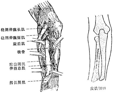 图10~57 尺、桡骨干双骨折切开复位(显露桡骨) 术后屈肘90度,前臂中立位,石膏托固定。两周后,换小夹板固定,6~8周解除外固定,内固定需坚持到骨折愈合较牢固后方能取出。 |