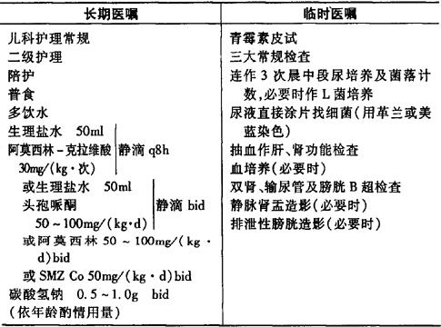 说明:1.尿路感染的病人,用抗生素前应尽快作尿常规和清洁中段尿培养。为配合选用药物,宜同时作尿沉渣找细菌,尽可能确定感染菌株类型,至少要分辨出是革兰阳性或阴性细菌,根据细菌培养、药敏试验选用抗生素。 2.尿培养和药敏试验未明确前,可先选用对革兰阴性杆菌敏感的药物1~2种。 3.急性发作期,若患儿为婴幼儿或全身症状明显者,最好选用静脉途径给药,也可联合用药。 4.抗生素疗程:急性尿路感染采用7~14天常规疗法,5岁以上无尿路畸形的单纯性膀胱炎患儿亦可选用单次大剂量或3~5日短程疗法。慢性尿路感染或复发性尿路感染为防再发,均需于常规疗程后改用复方磺胺甲基异噁唑小剂量维持,15~20mg/kg,临睡前口服,维持可长达1年以上。无症状菌尿不合并尿路畸形者无需治疗,合并畸形者因有导致肾瘢痕危险,在常规疗程后以小剂量抗生素维持。 |