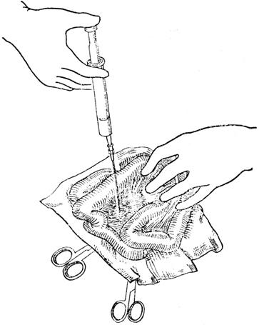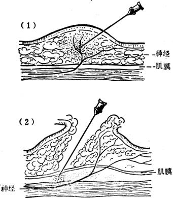 图1 腹壁的解剖层次和感觉神经分布模式图 二、一针技术 除于施行第一个皮丘时,病人有刺痛外,于其他部位注射麻药时病人不应再感疼痛。要做到这一点,每次将注射针刺入皮肤时,必须选择从已经浸润过麻药的部位进针,由此可减轻病人的痛苦(图2)。