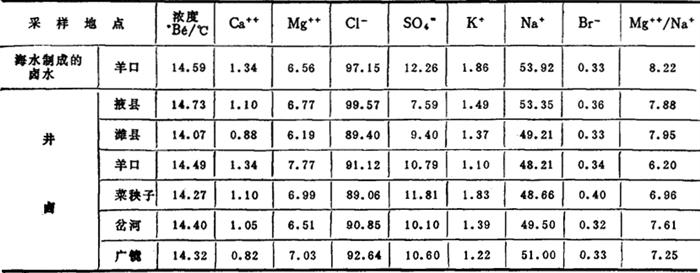 表2-1-13 莱州湾井卤、海卤(14°Bé左右)的主要离子含量(g/L)