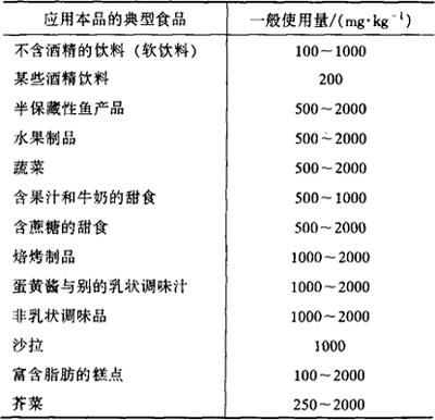溶液应随用随配,并防止加碱过多而使溶液呈碱性,影响抑菌效果。 (6)山梨酸用于需要加热的产品中,为防止山梨酸受热挥发,应在加热过程的后期添加。 2.使用范围及使用量 (1)我国《食品添加剂使用卫生标准》(GB 2760-1996)规定:用于肉、鱼、蛋、禽类制品,最大使用量为0.075g/kg;用于果蔬类保鲜、碳酸饮料,0.2g/kg;胶原蛋白肠衣、低盐酱菜、蜜钱、果汁(果味)型饮料、果冻,0.5g/kg;葡萄酒、果酒,0.6g/kg;酱油、食醋、果酱、氢化植物油、软糖、鱼干制品、即食豆制食品、糕点、馅、面包、蛋糕、月饼、即食海蜇、乳酸菌饮料果汁(果味)冰,1.0g/kg;用于食品工业用塑料桶装浓缩果蔬汁,2.0g/kg;以山梨酸计不得超过2g/kg。山梨酸及山梨酸钾同时使用时,以山梨酸计不得超过最大使用量,不得延长原定保质期。 (2)实际使用参考: ①我国台湾省《食品添加剂使用范围及用量标准》(1986)规定:用于鱼糜制品、肉制品、海胆酱、花生酱,最大使用量为2g/kg。 ②日本《食品卫生法规》(1985)规定:使用山梨酸钾,均以山梨酸计。用于干酪、鱼糜制品(碎肉除外),最高使用量为3g/kg。用于干酪,与丙酸、丙酸钙合用,或与含其中一种制剂合用时,其使用量按山梨酸及丙酸的合计量为3g/kg以下;用于鲸肉制品、肉制品、海胆,最高使用量为2g/kg;墨鱼熏制品、 ③一般参考用量如下表: