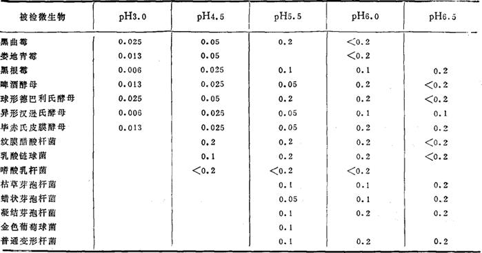 山梨酸钾的抗菌力(最小抑制浓度%)