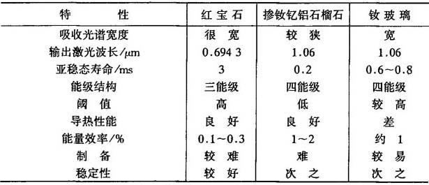 | 释义 | 工作物质 激光工作物质是决定激光器结构和性能的关键.对工作物质的物理性能有如下要求:有较宽的吸收光谱带,以便有较多的激活离子吸收光后被激发;荧光上能级为一亚稳态,亚稳态寿命较长,以利于粒子数反转;荧光光谱较窄;有较高的荧光量子效率,使大部分被光激发的离子容量过渡到产生荧光的上一能级;四能级系统比三能级系统更有利于建立粒子数反转;要有较好的导热性能;工作物质容易制备和进行光学加工. 目前,应用于加工的固体激光器的工作物质主要是红宝石、钕玻璃及掺钕钇铝石榴石(YAG).它们的特性见表2-2. 表2-2 几种主要激光工作物质的特性