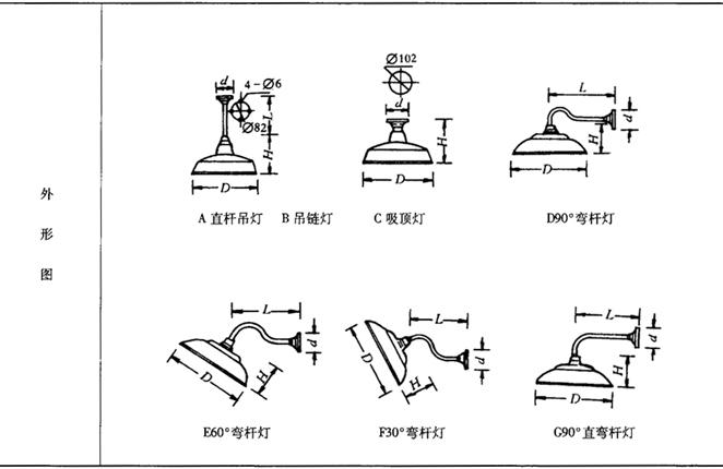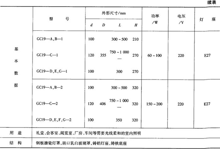 工厂灯具有配照型、广照型、深照型、斜照型以及防水防尘等,其外型安装尺寸及技术数据见表9-46~表9-64。表9-46 CC1配照型工厂灯