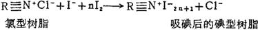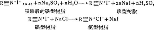 3.洗脱 先用淡水洗去树脂层中的制盐母液,分离其中的石膏等固体杂质,再用淡水淋洗,然后用洗脱液(含5~10%的亚硫酸钠和2%的食盐配成的)洗脱。洗脱液含碘量可达150g/L以上,洗脱率大于97%。其化学反应式为: