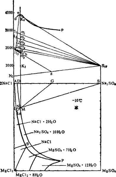 | 释义 | 工艺 影响盐田卤水冻硝的因素,主要有卤水浓度、冷冻温度、卤水组成及卤水深度等。 (-)卤水浓度 卤水浓度不仅影响芒硝的析出量,而且影响芒硝的质量。浓度过低,冰与芒硝同时析出,将增加芒硝中水分含量,降低芒硝的析出率;浓度过高,虽然芒硝析出率高,但有NaCl·2H2O同时析出,会影响芒硝质量。下面将不同浓度的盐田卤水组成标在图6-4-2中进行理论分析,并将分析结果列于表6-4-2中。表中的体系点m1,m2,m3,m4,m5与图6-4-2中水图上的体系点m1,m2,m3,m4,m5相对应,其对应的液相点为l1,12,13,14和15(水图上各小写字母与干盐图上各大写字母都是对应关系)。由图中各体系点和液相点的位置看出;m1,m2,m3和m4均在K0K1线段上,相应的液相点均在nl线段上(在干盐图上为NL线段上),说明1,2,3和4号卤水冷冻到-10℃时,只有Na2SO4·10H2O析出,并以24.3°Bé的卤水SO42-的析出率为最高,达67.3%。