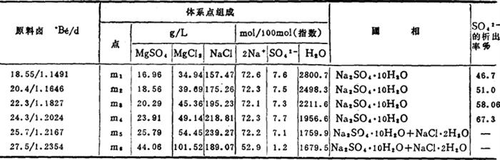 25.7°Bé卤水的体系点在水图上为m6点,落在K1K2线段上,说明此卤水冷冻至-10℃时有NaCl·2H2O伴随Na2SO4·10H2O析出;相应的液相点在水图上为15点,在干盐图上为L5点;固相点在水图上为g点,在干盐图上为G点(S10为水图上Na2SO410H2O的固相点,N2为NaCl·2H2O在水图上的固相点)。由G点的位置明显看出芒硝中含有较多的NaCl·2H2O,影响了芒硝的质量。 由此可知,冻硝卤水浓度在NaCl饱和前浓度越高,芒硝析出量越大,而且质量也较好。 对上述几种浓度的卤水进行冷冻试验,所得数据列于表6-4-3。 表6-4-3 不同浓度的卤水冻硝的试验结果(-10℃)