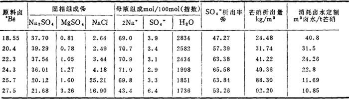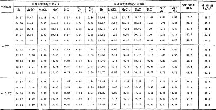 目前有两种盐田卤水作为冻硝的原料:一种是由原海水浓缩后所得卤水,称为“新卤冻硝”,新卤中钠镁比值为4~8;另一种是用低浓度卤水与制盐母液(28°Bé左右)掺兑,控制掺兑后的卤水浓度为22°Bé左右,称为“兑卤法冻硝”,其钠镁比值比新卤低。 卤水中的镁镁比值,在镁盐饱和前是基本稳定的,一般在2左右。 如果卤水的镁镁比值稳定在2.7左右,其钠镁比值的变化对冻硝的影响见表6-4-4。由表可知:在一定温度下,随着钠镁比值的增加,SO42-的析出率不断增加;芒硝析出量在最大值出现后,则呈下降趋势。在钠镁比值约等于2时,析出量出现最大值。因此,从提高单位面积产硝量的角度看,使用Na/Mg比值接近2的卤水冻硝较为有利。 表6-4-4 卤水浓度、组成及冷冻温度与芒硝析出量、析出率的关系