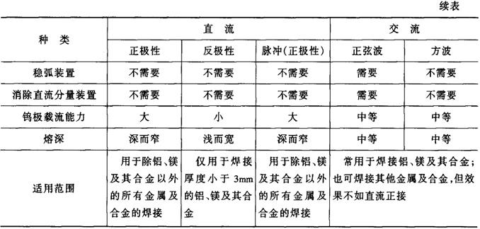 | 释义 | 工艺参数的选择 TIG焊的工艺参数主要有:电流的种类及极性、焊接电流的大小、焊接速度、钨极直径及形状、保护气体流量等。 1.电流的种类及极性 不同的电流种类及极性具有不同的工艺特点,适用于不同材料的焊接。因此应首先根据工件的材料选择电流的种类及极性,如表1-6-26所示。 表1-6-26 不同电流类型及极性接法的特点及应用范围[6]