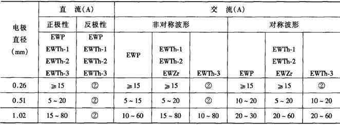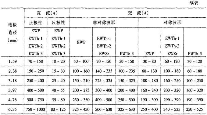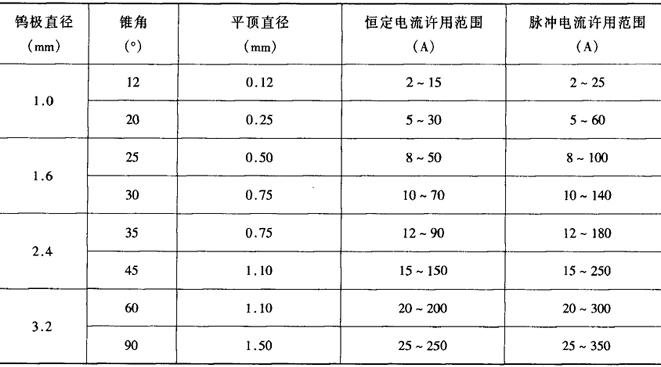 脉冲TIG焊时,由于在基值电流期间钨极受到冷却,所以直径相同的钨极之许用电流值明显提高,如表1-6-29所示。 表1-6-29 脉冲TIG焊推荐用的钨极端部形状尺寸及许用电流[7](直流正接)