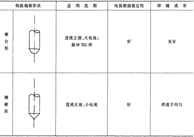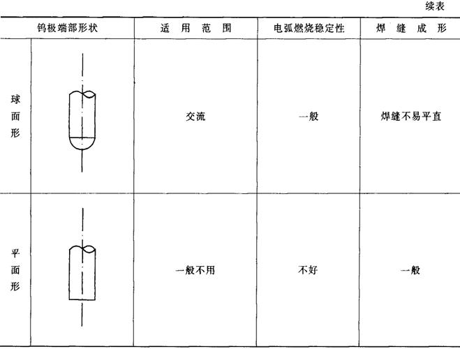 注:①所有数据均为纯氩气做保护气体时的数据;②一般不采用。 电极的端部形状对焊接过程稳定性及焊缝成形具有重要影响,通常应根据电流的种类、极性及大小来选择,表1-6-28给出了钨极各种端部形状所适用的范围及其对电弧稳定性及焊缝成形的影响。 表1-6-28 电极的不同端头形状的适用范围及其对电弧稳定性及焊缝成形的影响[8]